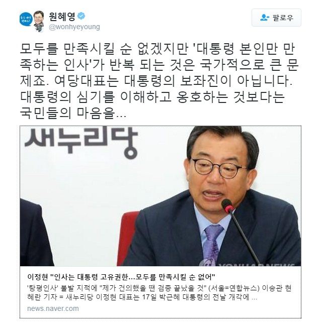 [아시아경제 강성민 인턴기자] 더불어민주당 원혜영 의원이 박근혜 대통령의 개각에 대해 ‘대통령 본인만 만족하는 인사’라고 비난했다.더민주 원 의원은 17일 자신의 트위터를 통해 “'대통령 본인만 만족하는 인사'가 반복 되는 것은 국가적으로 큰 문제다. 여당 대표는 대통령의 보좌진이 아니다”라고 비판했다.이는 새누리당 이정현 대표가 17일, 박 대통령의 개각에 대한 여당 등의 비판과 관련 “인사는 대통령의 고유권한으로 모두를 만족시킬 수는 없는 것”이라고 말한 것에 대해 유감을 표시한 것으로 풀이된다.이 대표는 이날 기자들과 만난 자리에서 박 대통령에게 건의한 ‘탕평인사’가 제대로 지켜지지 않았다는 지적에 대해 “인사라는 건 상당한 검증이 필요한데, 제가 (대표에) 당선돼서 갔을 때는 이미 검증이 다 진행돼서 끝나지 않았을까”라고 말한 바 있다.원 의원은 이러한 해명을 두고 “대통령의 심기를 이해하고 옹호하는 것보다는 국민들의 마음을 헤아려야 한다”고 강조했다.한편 야당은 16일 개각에서 처가와 넥슨의 부동산 거래 문제 등 각종 의혹에 휩싸인 우병우 청와대 민정수석에 대한 조치가 이루어지지 않는 등 이번 박 대통령의 개각 전반에 대해서 비판을 쏟아냈다. 더민주 김종인 대표는 17일 당 회의에서 “박 대통령이 3개 부처를 개각했는데, 개각 자체에 어떤 의미를 부여해야 하는지 전혀 이해가 가지 않는다”고 말했다. 이어 “국민이 쏟아내는 의사를 제대로 반영하지 못하는 정권은 성공하기 매우 어렵다”고 했다. 아울러 김 대표는 “지금의 국정 운영 스타일을 보면 대통령은 명령하고 장관은 무조건 복종하는 형태”라며 “과연 정부가 국민이 바라는 바에 따라 운영되는 정부인지 대통령의 말만 듣는 정부인지 답답하기 짝이 없는 실태”라고 했다.이에 국민의당 박지원 비상대책위원장은 “박 대통령의 국민 무시, 야당 무시에 굴하지 않고 탕평·균형 인사를 주장하기 위해 당력을 집중하겠다”고 말했다.강성민 인턴기자 yapal1@asiae.co.kr<ⓒ세계를 보는 창 경제를 보는 눈, 아시아경제(www.asiae.co.kr) 무단전재 배포금지>
