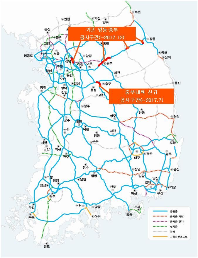 [아시아경제 주상돈 기자] 한국도로공사가 오는 22일부터 2017년 7월까지 중부내륙고속도로(괴산나들목∼충주분기점) 31.4㎞ 구간의 노후시설물에 대한 전면 개량 공사에 나선다고 18일 밝혔다. 공사기간 중 작업구간 양방향 1개 차로의 통행이 제한된다.중부내륙고속도로는 높은 화물차량 통행 비중과 험준한 산악 구간 통과 등으로 그동안 교통안전성 개선이 시급한 것으로 지적돼 왔다. 실제 이 도로의 교통사고 사망률(사고 1건당 사망자수)은 올해만 13.1%로 전체 고속도로 사망률(6.1%)보다 7%포인트 높다. 또 이번 개량공사 구간에는 터널 8개소와 교량 22개소가 설치돼 있고, 평일 주간 기준 화물차량의 통행 비중이 30%에 달해 노면 파손상태가 심각한 상황이다.공사기간 중에는 작업구간별로 양방향 1개 차로의 통행이 제한된다. 도로공사는 22일부터 양평방향 충주 나들목~충주 휴게소(5.30㎞) 구간과 창원방향 충주 분기점~북충주 나들목(5.73㎞) 구간의 보수를 우선 착수할 계획이다.도로공사는 공사가 완료되면 노면 상태와 구조물과 가드레일 등의 안전시설이 전면 개선돼 신설 고속도로 수준의 안전하고 쾌적한 도로가 될 것으로 기대하고 있다. 사업구간 내 교통사고 사상자가 35% 감소하고 이에 따른 사회적 손실도 140억원 가량 줄어들 것으로 예상하고 있다.도로공사는 공사시행으로 인해 차량 정체가 불가피한 만큼 교통전광판과 우회도로 안내 입간판, 고속도로 교통정보 앱 등을 활용한 다각적 홍보를 실시해 정체를 최소화할 계획이다. 또 추석·설 명절기간과 연휴기간, 동계 제설기간에는 작업 중지를 통해 사전에 정체를 방지할 방침이다.도로공사 관계자는 "공사기간 중 이 구간을 지나는 운전자들은 교통상황과 우회도로를 확인한 후 목적지로 이동하는 것이 좋다"며 "대신 경부선과 당진영덕선, 중부선, 중앙선 등을 이용하거나 이 구간을 통과할 경우 국도 3·19·37·38호선과 지방도 82·599호선 등을 이용하길 바란다"고 말했다.주상돈 기자 don@asiae.co.kr<ⓒ세계를 보는 창 경제를 보는 눈, 아시아경제(www.asiae.co.kr) 무단전재 배포금지>
