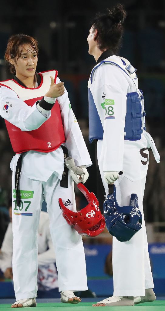 [리우데자네이루=연합뉴스] 17일(현지시간) 브라질 리우데자네이루 바하 카리오카 경기장 3에서 열린 2016 리우올림픽 태권도 여자 -49kg급 결승전에서 한국 김소희가 세르비아 티야나 보그다노비치를 상대로 승리하고 인사를 나누고 있다.<저작권자 ⓒ ㈜연합뉴스. 무단 전재 재배포 금지.>