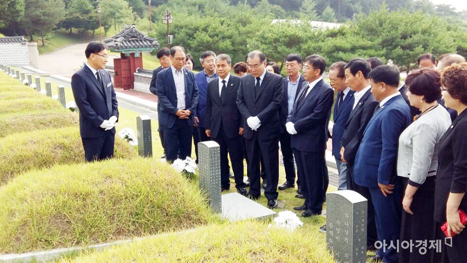 "지역위원장, 지방의원, 당직자 등 50여명 참여"[아시아경제 노해섭 기자]더불어민주당 전남도당 위원장에 추대된 이개호 위원장(담양·함평·영광·장성 국회의원)이 연임 후 첫 공식 일정으로 지역위원장, 지방의원, 당직자 등과 함께 국립 5·18민주묘지를 찾아 오월 영령들을 추모했다. 이개호 위원장은 18일 오전 9시 광주시 북구 운정동 5·18민주묘지를 찾아 최정길 묘지관리소장의 안내로 추모탑에 헌화·분향했다. 이날 참배에는 김종현 목포지역위원장, 전남도의회 이장석 부의장 과 임용수 수석대변인을 비롯한 더민주 소속 도의원과 시·군 의원, 상설 위원장, 사무처 당직자 등 50여명이 참여했다.이 위원장은 참배에 앞서 방명록에 "5·18정신 이어받아 정권교체 반드시 이룩하겠습니다”라고 적고 위원장 수락연설을 통해 밝혔던 호남민심 회복과 2017년 정권교체를 위해 전남도당이 앞장서겠다는 결의를 다졌다.노해섭 기자 nogary@<ⓒ세계를 보는 창 경제를 보는 눈, 아시아경제(www.asiae.co.kr) 무단전재 배포금지>