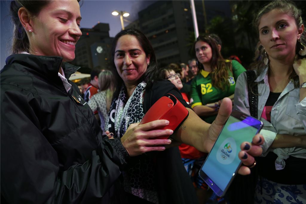 브라질 리우 코파카바나 비치에 마련된 삼성전자 갤럭시 스튜디오에서 대구창조경제혁신센터가 육성한 기업 '스케치온'이 자사의 스킨 프린터 '프링커(Prinker)'와 삼성전자 갤럭시 노트를 이용해 방문객들에게 일회용 문신을 새겨주고 있다.