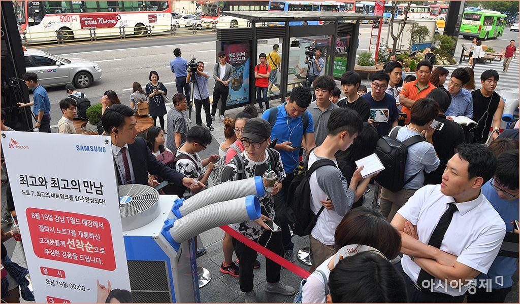 [아시아경제 윤동주 기자] 19일 서울 강남구 SKT 강남점에서 열린 갤럭시노트7 개통행사에 많은 고객들이 갤노트7 개통을 위해 길게 줄을 서고 있다.윤동주 기자 doso7@asiae.co.kr<ⓒ세계를 보는 창 경제를 보는 눈, 아시아경제(www.asiae.co.kr) 무단전재 배포금지>