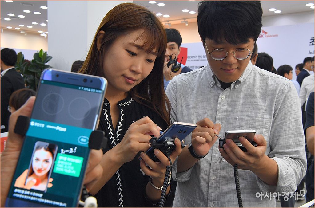[아시아경제 윤동주 기자] 19일 서울 강남구 SKT 강남점에서 열린 갤럭시노트7 개통행사를 찾은 고객들이 갤노트7을 체험하고 있다.윤동주 기자 doso7@asiae.co.kr<ⓒ세계를 보는 창 경제를 보는 눈, 아시아경제(www.asiae.co.kr) 무단전재 배포금지>