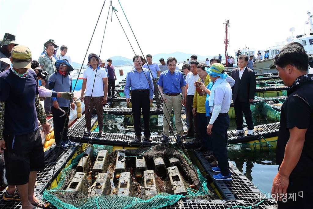 이낙연 전남지사가 20일 오전 고수온 등 복합적 원인으로 전복폐사 피해를 입은 완도군 금일해상 가두리양식장을 찾아 현황을 살피고 어업인들과 대화했다. 신우철 완도군수, 박현호 도의원이 동행했다. 사진제공=전남도