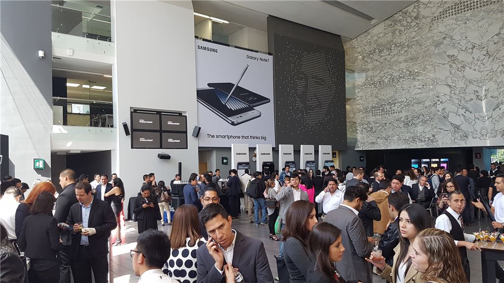 [아시아경제 김유리 기자] 삼성전자 '갤럭시노트7'이 19일(현지시간) 한국을 비롯한 글로벌 10여개국에 일제히 출시됐다. 국내뿐만 아니라 멕시코, 싱가포르, 호주 등 해외에서도 갤럭시노트7을 빨리 손에 넣고자 하는 소비자들이 긴 줄을 늘어서는 등 인기를 실감케 했다. 이날 멕시코 멕시코시티에 위치한 '떼아뜨로 로베르또 깐토랄(Teatro Roberto Cantoral)' 센터에서 진행된 삼성전자 갤럭시노트7 공개 행사에 현지 미디어, 거래선 등 250여명이 참석했다.