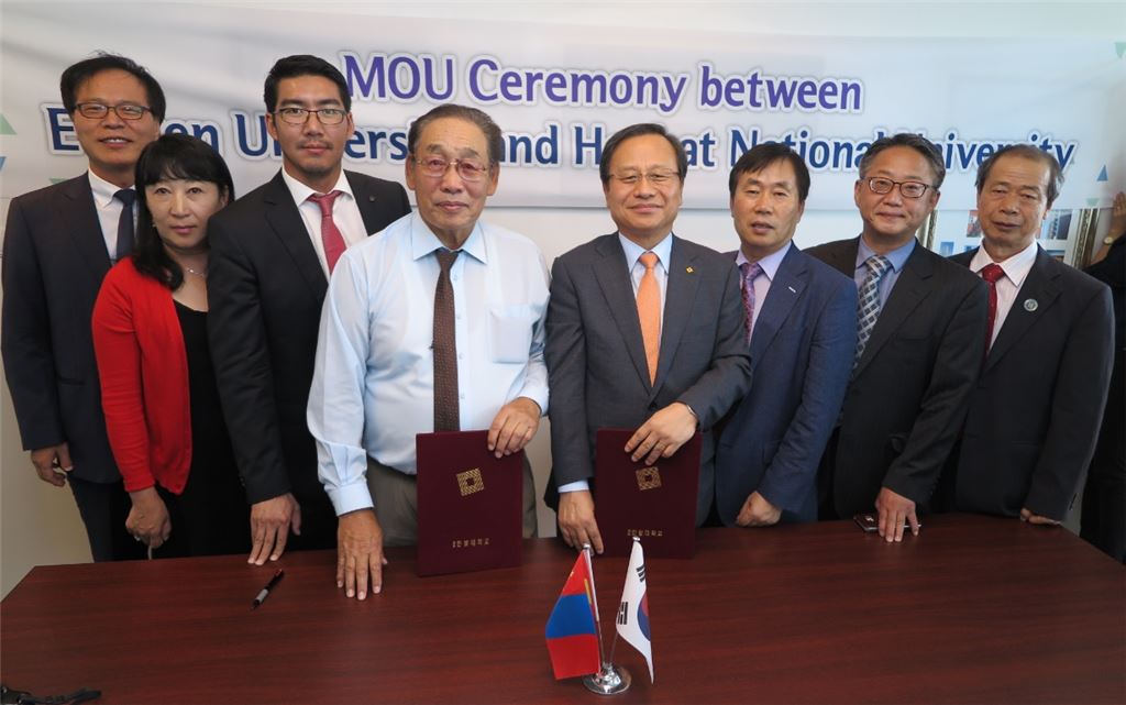 [아시아경제(대전) 정일웅 기자] 한밭대는 최근 송하영 총장 등 대학관계자들이 몽골 올란바토르 소재 에트켄 대학을 방문, 양 대학간 국제교류 협약을 체결했다고 22일 밝혔다. 협약에 따라 에트켄 대학은 한밭대와 경상·이공계열 중심의 교류를 통해 대학의 교육 프로그램을 선진화하고 산학협력 모델을 벤치마킹 하게 된다. 송 총장(왼쪽 네 번째)과 몽골 남쟉 이사장(오른쪽 네 번째) 등 양 대학 관계자들이 협약식을 마치고 기념촬영을 하고 있다. 한밭대 제공대전=정일웅 기자 jiw3061@asiae.co.kr<ⓒ세계를 보는 창 경제를 보는 눈, 아시아경제(www.asiae.co.kr) 무단전재 배포금지>정일웅 기자 jiw3061@asiae.co.kr<ⓒ아시아 대표 석간 '아시아경제' (www.newsva.co.kr) 무단전재 배포금지>
