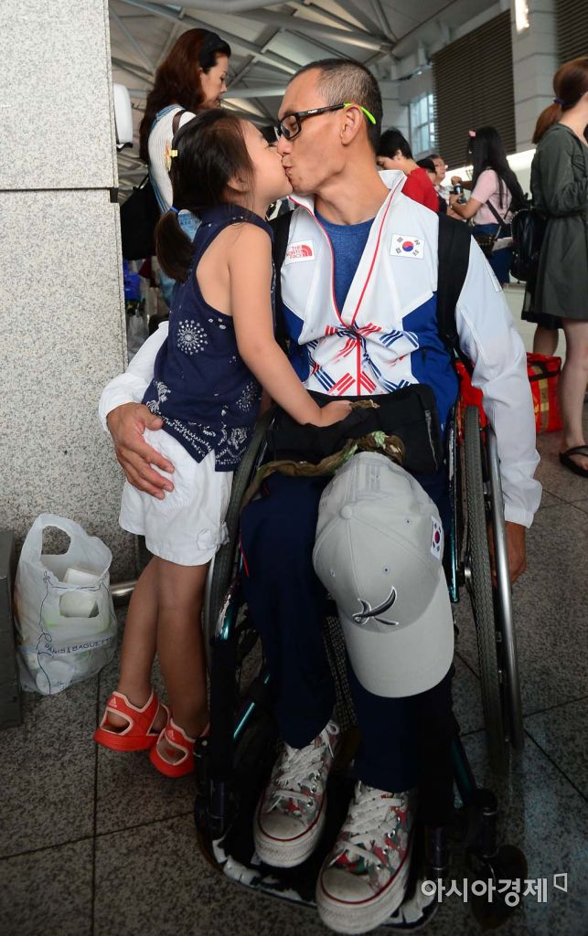 [아시아경제 백소아 기자] 23일 인천광역시 인천국제공항 출국장에서 열린 2016 리우패럴림픽대회 한국선수단 환송식에서 육상대표 정동호 선수가 딸 이레양에게 응원의 뽀뽀를 받고 있다.백소아 기자 sharp2046@asiae.co.kr<ⓒ세계를 보는 창 경제를 보는 눈, 아시아경제(www.asiae.co.kr) 무단전재 배포금지>