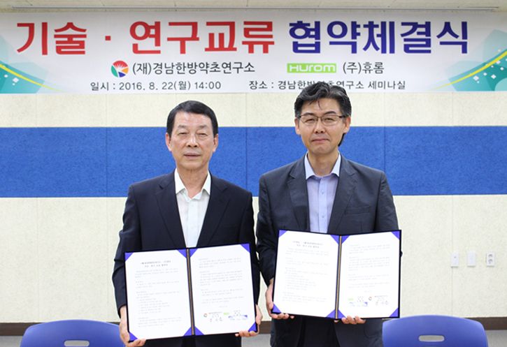 이차우 휴롬 상무(오른쪽)가 장사문 경남한방약초연구소 소장과 기술 및 연구 교류 협약을 체결하고 기념촬영을 하고 있다.
