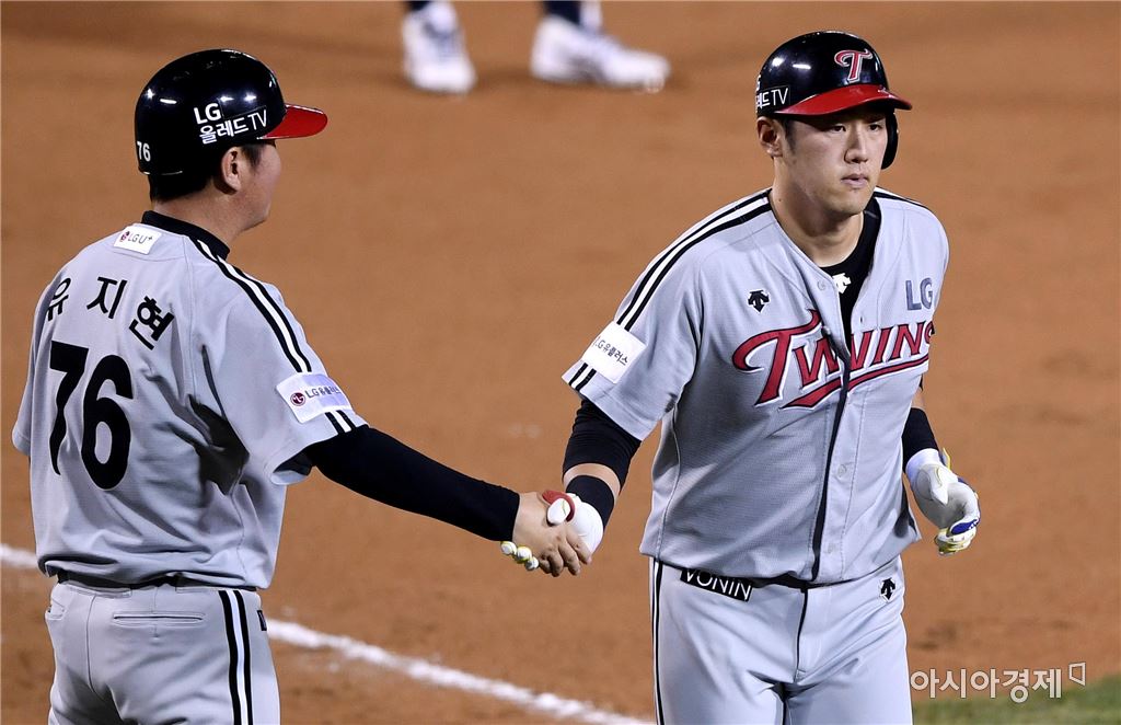 [아시아경제 김현민 기자]프로야구 LG 트윈스와 두산 베어스의 2016 KBO리그 경기가 23일 잠실구장에서 열렸다. 9회초 LG 선두타자 양석환이 두산 마무리 이현승을 상대로 동점 솔로 홈런을 치고 유지현 코치와 하이파이브하고 있다. 연타석 홈런.김현민 기자 kimhyun81@asiae.co.kr<ⓒ세계를 보는 창 경제를 보는 눈, 아시아경제(www.asiae.co.kr) 무단전재 배포금지>