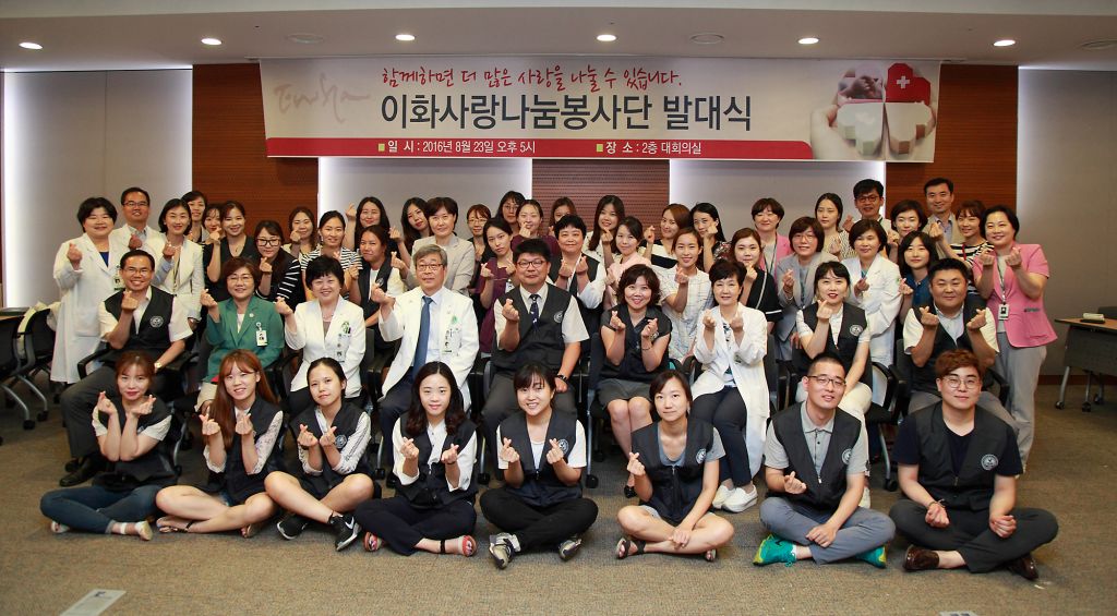 이화여자대학교 의료원이 23일 이대목동병원 2층 대회의실에서 ‘이화사랑나눔봉사단’ 발대식을 갖고 기념촬영을 하고 있다.