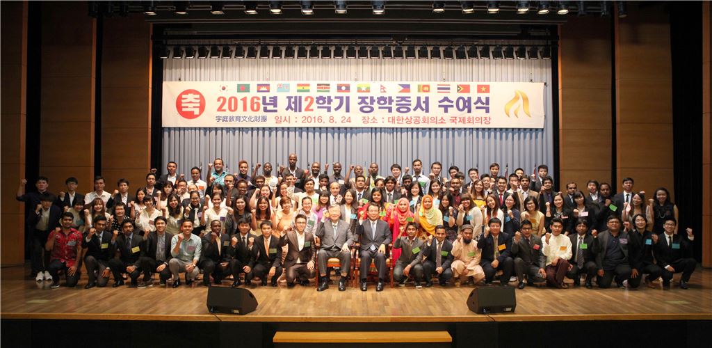 24일 서울 세종대로 대한상공회의소에서 열린 우정교육문화재단의 '2016년 2학기 해외유학생 장학금 수여식'에서 이중근 부영그룹 회장 겸 우정교육문화재단 이사장을 비롯한 참석자들이 기념촬영을 하고 있다.(제공: 부영그룹)
