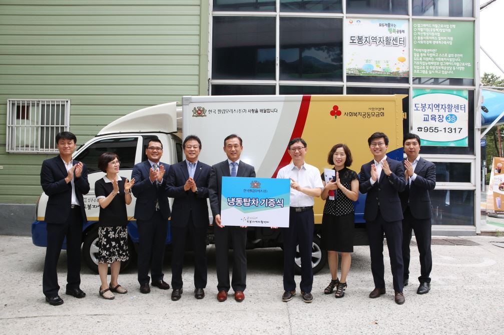 한국필립모리스가 25일 서울시 도봉구에 위치한 도봉지역자활센터에서 냉동탑차를 전달하는 기증식을 가졌다. 왼쪽 네번째부터 사회복지공동모금회 김석현 본부장, 한국필립모리스㈜ 김병철 전무, 도봉지역자활센터 송건 센터장.