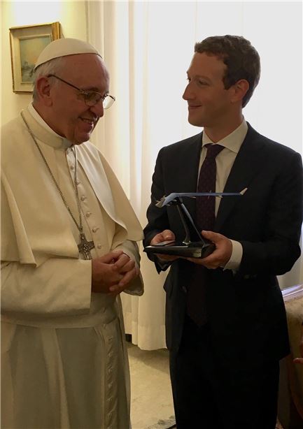 마크 저커버그 페이스북 CEO가 29일(현지시간) 바티칸에서 프란시스 교황을 만나 아퀼라 드론 모형을 선물하고 있다.(사진출처:저커버그 페이스북)