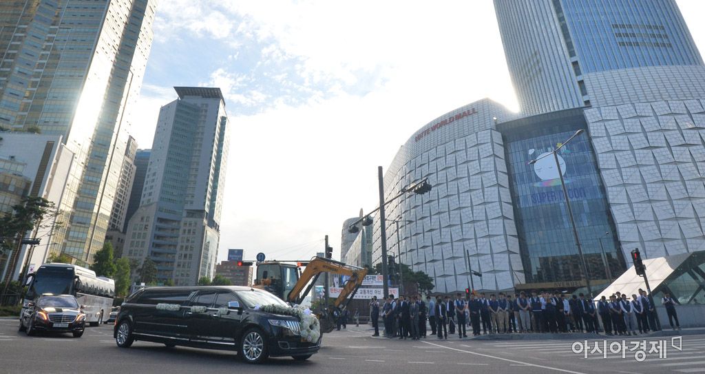[아시아경제 문호남 인턴기자] 故 이인원 롯데그룹 부회장의 운구차량이 30일 서울 송파구에 위치한 그룹의 상징인 롯데월드타워를 경유하고 있다. 운구차량은 서울 추모공원으로 이동해 화장 후 장지인 남양주 모란공원으로 향한다.문호남 인턴기자 munonam@asiae.co.kr<ⓒ세계를 보는 창 경제를 보는 눈, 아시아경제(www.asiae.co.kr) 무단전재 배포금지>