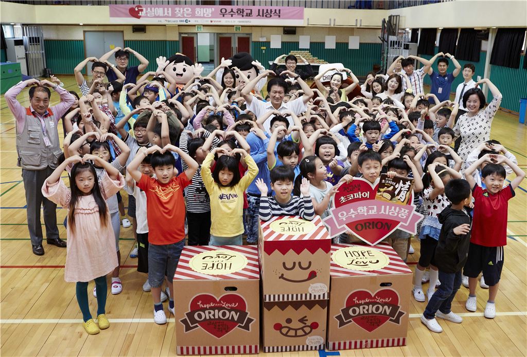 [아시아경제 이주현 기자]오리온은 국제구호개발 NGO 월드비전과 함께한 학교폭력 예방 캠페인 ‘교실에서 찾은 희망’ 우수학교 시상식을 서울 혜화초등학교에서 진행했다고 30일 밝혔다.2012년에 시작해 올해로 5회째를 맞는 ‘교실에서 찾은 희망’은 캠페인송과 플래시몹 연습 등을 통해 학생 스스로 행복한 학교, 함께하는 교실문화를 만들어 나가는 캠페인이다. 오리온은 함께 나누는 정(情) 문화의 전파를 위해 지난해에 이어 2년 연속 후원하고 있다. 29일 열린 이번 캠페인은 지난 4월부터 7월까지 12주간에 걸쳐 진행됐으며, 올해는 지난해보다 참여율이 45% 이상 증가해 전국 933개 학교와 4만3538명의 학생들이 참여했다. 뿐만 아니라 학생들이 참여한 유튜브 영상 누적 조회수도 전년대비 270% 증가해 캠페인에 대한 관심이 점점 높아지고 있음을 보여줬다.오리온은 캠페인 기간 동안 매주 심사를 거쳐 '으뜸상'과 '아차상'을 선정, 총 900팀을 대상으로 1억 원 상당의 대형 스낵박스를 전달했다. 또한 캠페인 종료 후에는 지역별 최우수학교를 선정해 각 학교 전교생에게 4만여 개의 초코파이를 선물했다.이날 열린 시상식에서 오리온은 혜화초등학교 전교생 770명에게 초코파이와 고래밥을 나눠줬다. 이와 함께 최고 점수를 받은 베스트 영상을 시청하고, 퀴즈쇼를 진행해 재미를 더했다. 또한 캠페인송에 맞춰 현장에서 플래시몹을 펼치는 등 학생들이 직접 참여하는 다양한 이벤트로 시상식의 의미를 더했다.이주현 기자 jhjh13@asiae.co.kr<ⓒ세계를 보는 창 경제를 보는 눈, 아시아경제(www.asiae.co.kr) 무단전재 배포금지>