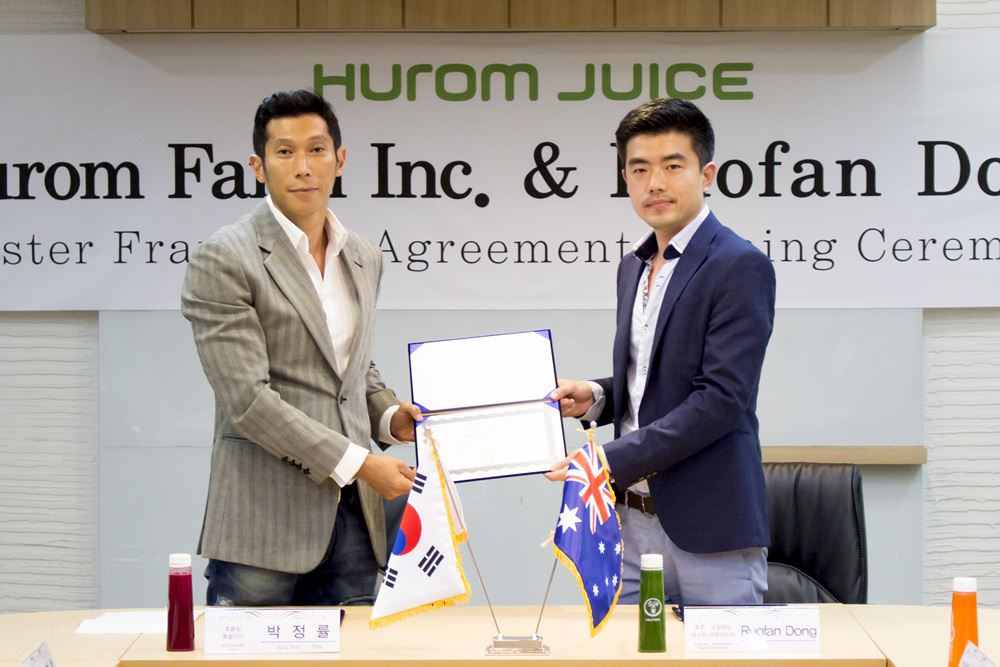 박정률 휴롬팜 대표(왼쪽)와 호주 현지사업가인 루펀동씨가 현지 시장 진출을 위한 마스터 프랜차이즈 계약을 체결하고 기념촬영을 하고 있다. <br />