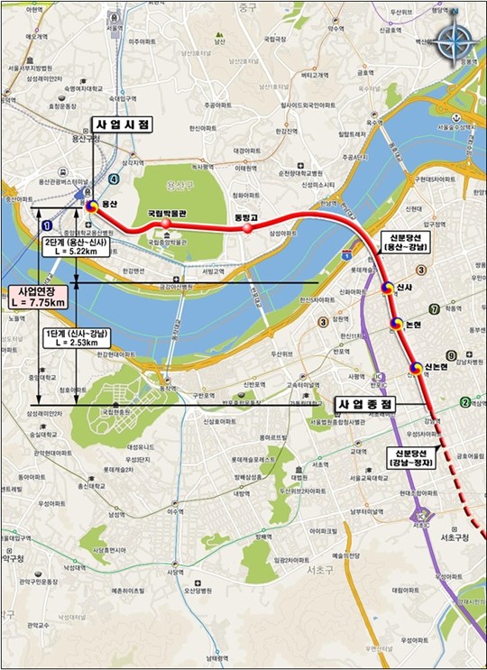 [아시아경제 유연수 인턴기자] 신분당선 연장선 신사~강남 구간(2.5㎞)이 착공에 들어간다. 이를 통해 수원, 광교, 용인, 분당, 판교 등 수도권 동남부 주민들의 도심접근성이 개선될 것으로 예상된다. 국토교통부는 사업비 8721억 원(보상비 71억 원 별도)을 투입하는 신분당선 용산~강남 복선전철 사업 구간(7.8㎞) 중 1단계 신사~강남 구간(2.5㎞)을 착공한다고 30일 밝혔다. 이번 공사는 현재 광교신도시에서 강남역까지 운행하는 신분당선을 신논현역(9호선), 논현역(7호선), 신사역(3호선)까지 연장하는 사업 중 1단계다. 완공되면 광교에서 신사까지 16분(56분→40분) 단축된다. 2단계는 용산 미군기지를 통과하는 한강 북측구간(용산~신사)을 연결하는 것으로, 광교에서 용산까지 이동시간이 36분(83분→47분) 단축된다. 내년 용산 미군기지 이전이 확정된 이후 추진될 계획이다. 2단계 사업까지 마무리되면 신분당선이 남측으로는 강남∼정자, 정자∼광교 노선과 직결되고 북측으로는 용산역(1호선), 신사역(3호선), 논현역(7호선), 신논현역(9호선)과 환승이 가능해진다. 국토부 관계자는 신분당선 신사역 구간 연장 개통이 출퇴근 교통난 해소와 경부고속도로 운행 차량 감소 등에 기여할 것으로 예상한다고 밝혔다. 유연수 인턴기자 you0128@asiae.co.kr<ⓒ세계를 보는 창 경제를 보는 눈, 아시아경제(www.asiae.co.kr) 무단전재 배포금지>