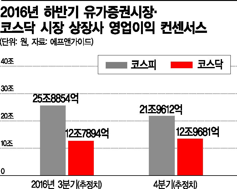 올해 하반기 상장사들의 영업이익 전망에 빨간불이 켜졌다. 미국 금리 추가 인상 현실화와 글로벌 경기 불투명으로 상장사들의 영업이익 하향세가 두드러지고 있다. 삼성전자 등 대형주들만 나 홀로 질주를 할 것이라는 전망이다. 30일 금융정보 업체 에프앤가이드에 따르면 증권사 3곳 이상이 추정한 하반기 코스피와 코스닥시장 상장사 영업이익 기대치 합계는 73조6043억원으로 집계됐다. 시장별로 보면 코스피 상장사 171개의 4분기 영업이익 기대치는 21조9612억원으로 3분기 영업이익 기대치 25조8854억원보다 20% 줄었다. 코스피 영업이익 기대치에서 삼성전자가 차지하는 비중은 3, 4분기 모두 30%에 달하는 것으로 나타났다. 상반기에 이어 하반기에도 삼성전자는 높은 기대치를 보였다. 증권가의 삼성전자 3, 4분기 실적 추정치 평균은 3개월 전 조사 때보다 모두 20% 넘게 상향 조정됐다. 삼성전자의 3분기 실적 컨센서스(증권사 추정치 평균ㆍ추정기관 3곳 이상 기준)는 매출액이 51조9535억원, 영업이익은 8조2044억원, 순이익은 6조2768억원으로 집계됐다. 4분기에도 매출액 53조7486억원, 영업이익 7조9133억원, 순이익 6조514억원에 달한다. 하지만 나머지 상장사들은 상황이 다르다. 3분기에 종목별로는 하나투어가 한 달 전 155억3100만원의 영업이익을 올릴 것으로 기대됐으나 현재는 119억7600만원으로 22.89% 하향 조정됐다. 호텔신라도 같은 기간 437억4900만원에서 381억2200만원으로 12.86% 감소됐다. LG전자(-14.26%), 삼성전기(-13.65%), 롯데쇼핑(-11.95%), 삼성엔지니어링(-11.57%), 오리온(-10.76%) 등의 영업이익도 두 자릿수 이상 하락할 것으로 추정됐다. 반면 코스닥 상장사 79개의 4분기 영업이익 기대치는 12조9681억원으로 3분기 영업이익 기대치 12조7894억원보다 늘어날 것으로 나타났다. 다만 코스닥 상장사들은 3분기에 실적 악화가 빠르게 진행되고 있다. 카카오, KH바텍, 조이시티, 오스템임플란트, 게임빌이 대표적이다. 한 달 전 카카오의 영업이익 기대치는 486억원이었으나 지금은 309억원으로 약 40% 감소했다. KH바텍은 89억원에서 34억원으로 한 달 새 영업이익 추정치가 반토막이 났다. 또 컴투스(573억원→463억원), 오스템임플란트(120억원→84억원), 조이시티(79억원→46억원) 등도 한 달 새 영업이익 추정치가 두 자릿수가 넘는 하락률을 나타냈다. 이 밖에도 CJ E&M(-7.91%), 인터파크(-7.85%), GS홈쇼핑(-7.14%), 솔브레인(-5.43%), 매일유업(-3.08%) 등도 하락률을 보였다. 곽현수 신한금융투자 연구원은 "3, 4분기 미국 금리 인상 이후 상대적으로 저평가된 주식이 안전하다는 인식이 확산되며 저PBR(주가순자산비율) 종목군이 많은 대형주가 상대적인 강세를 보일 것"이라며 "코스닥 등 중소형주가 대형주 강세 흐름에 동승하기 위해서는 금리보다는 미국 대선 향방이 중요하다"고 말했다.유인호 기자 sinryu007@asiae.co.kr<ⓒ세계를 보는 창 경제를 보는 눈, 아시아경제(www.asiae.co.kr) 무단전재 배포금지>