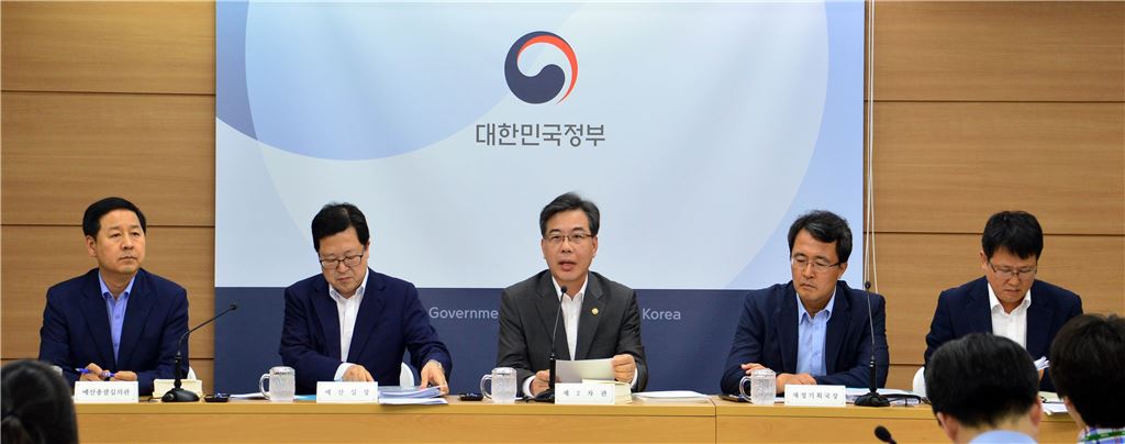 송언석 기획재정부 2차관(가운데)이 25일 정부세종청사에서 2017년도 예산안을 설명하고 있다.