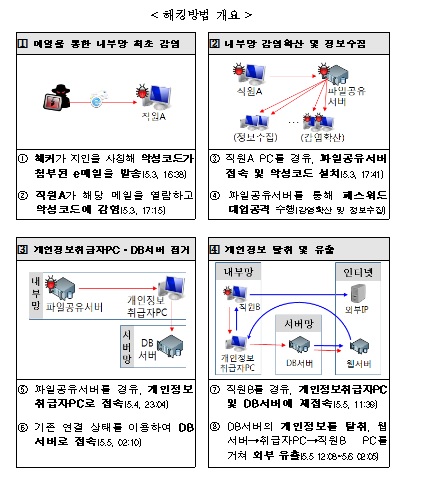 [아시아경제 안하늘 기자] 지난 5월 온라인 쇼핑몰 인터파크에서 발생한 해킹 사고로 유출된 이름, 성별, 생년월일, 휴대폰 번호 등 이용자 회원정보가 총 2665만8753건인 것으로 조사됐다.미래창조과학부와 방송통신위원회는 31일 이런 내용의 '민ㆍ관 합동조사단'의 조사결과를 발표했다. 조사결과 해커는 지인을 사칭해 악성코드가 첨부된 이메일을 발송하는 방법(스피어피싱)으로 인터파크의 직원 PC에 악성 코드를 설치했다. 스피어피싱이란 특정 개인이나 기관의 약점을 교묘하게 겨냥해 작살(스피어)을 던지듯 하는 해킹 공격을 뜻한다. 이렇게 심어진 악성 코드는 인터파크 사내의 다수 전산 단말기에 퍼졌고, 해커는 이를 활용해 내부 정보를 수집했다. 특히 해커는 고객 개인정보의 저장고인 데이터베이스(DB) 서버를 관리하는 '개인정보 취급자 PC'로 접속하는데 성공했다.이후 해커는 인터파크 회원정보 2665만8753건이 보관된 파일을 16개로 분할하고 직원PC를 경유해 이를 외부로 유출했다.세부적으로 유출된 회원정보는 ▲인터파크 일반회원의 아이디, 암호화된 비밀번호, 이름, 성별, 생년월일, 전화번호, 휴대전화번호, 이메일, 주소 등 1094만7544건 ▲제휴사 아이디 245만4348건 ▲탈퇴회원 아이디 173만4816건 ▲휴먼회원 아이디, 암호화된 비밀번호 1152만2045건이다.이번 조사는 지난 달 28일 경찰청의 중간 수사 결과 발표와 병행해 해킹 사고의 원인 분석을 위해 실시됐다. 당시 경찰청은 해킹이 북한 정찰총국 소행으로 판단된다고 발표한 바 있다.미래부는 이번 조사과정에서 발견된 문제점을 개선ㆍ보완할 수 있도록 조사결과 및 개선사항 공유 등 보안강화 기술지원을 실시했다. 방통위는 침해사고를 인지한 후 인터파크에서 개인정보 유출 침해사고를 확인하고 해당 피해사실 및 이용자 조치방법 등을 이용자에게 통지토록 조치했다.송정수 민관합동조사단 단장(미래부 정보보호정책관)은 "침해사고가 발생한 경우 미래부 등 관계기관에 즉시 신고하여야 하며, 증가하는 북한의 사이버 도발 위협에 대비하여 개인정보보호 및 사이버보안 체계를 재점검하는 등 정보보호 노력을 강화하는 것이 매우 중요하다"고 강조했다.안하늘 기자 ahn708@asiae.co.kr<ⓒ세계를 보는 창 경제를 보는 눈, 아시아경제(www.asiae.co.kr) 무단전재 배포금지>
