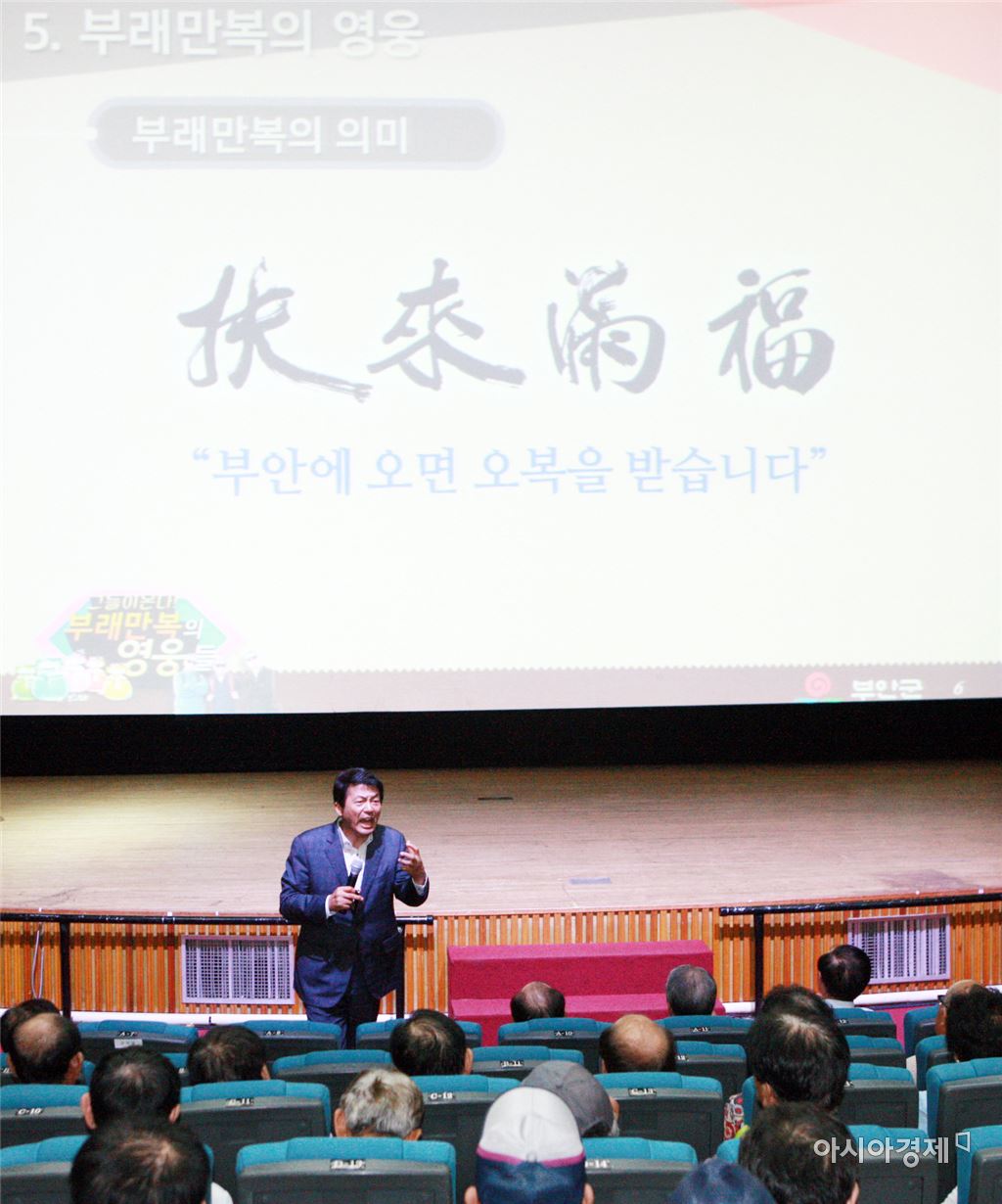 [아시아경제 김재길 기자]김종규 부안군수는 지난 8월 26일 부안예술회관 공연장에서 대한노인회 부안군지회 임원 및 각 읍면 경로당회장 등 500명을 대상으로 특강을 실시했다.이번 특강은 부안군지회 요청과 평소 노인복지에 깊은 관심을 보여온 김종규 군수의 의지로 이뤄졌다.김종규 군수는 ‘부래만복의 영웅들이 왔다’라는 주제의 특강에서 재미있고 흥미로운 부안의 오복오감과 생거부안의 다양한 일화와 내용을 소개해 참석자들로부터 뜨거운 박수갈채를 받았다. 특강에 참석한 한 어르신은 “강의가 딱딱하지 않고 유쾌하고 화기애애한 분위기에서 이뤄졌다”며 “복중의 복은 말년복이고 말년복은 건강복이라는 김종규 군수의 말에 공감했다. 앞으로로 이런 유익한 특강이 자주 있었으면 좋겠다”고 말했다.김재길 기자 <ⓒ세계를 보는 창 경제를 보는 눈, 아시아경제(www.asiae.co.kr) 무단전재 배포금지>