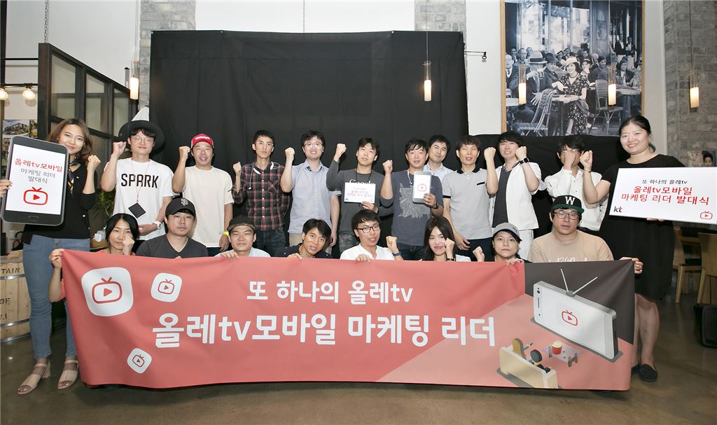 [아시아경제 박소연 기자]KT는 올레tv모바일 서비스 홍보를 위해 일반인으로 구성된 ‘마케팅 리더’(체험단) 20명을 선정해 지난 1일 발대식을 진행했다고 2일 밝혔다.‘올레tv모바일 마케팅 리더’는 평소 모바일TV를 통해 다양한 콘텐츠를 즐기는 20ㆍ30ㆍ40대로 구성돼 올레tv모바일의 홍보 대사로 활동할 계획이다.박소연 기자 muse@asiae.co.kr<ⓒ세계를 보는 창 경제를 보는 눈, 아시아경제(www.asiae.co.kr) 무단전재 배포금지>