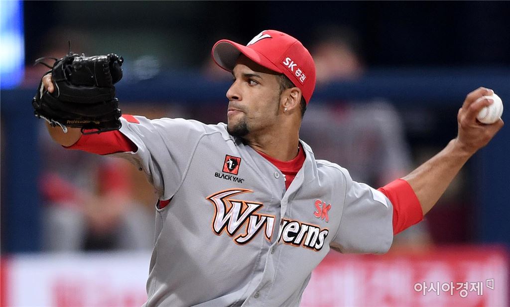 [아시아경제 김현민 기자]프로야구 SK 와이번스와 넥센 히어로즈의 2016 KBO리그 경기가 2일 서울 고척스카이돔에서 열렸다. 5회말 SK 김주한에 이어 마운드에 오른 라라가 역투하고 있다. 김현민 기자 kimhyun81@asiae.co.kr<ⓒ세계를 보는 창 경제를 보는 눈, 아시아경제(www.asiae.co.kr) 무단전재 배포금지>