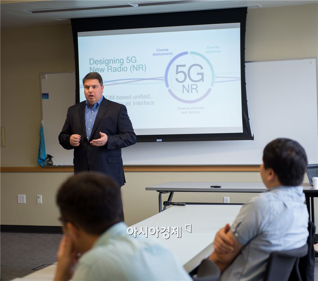 3일(현지시간) 미국 캘리포니아 샌디아고 퀄컴 본사에서 맷 그로브 퀄컴 총괄 부사장(최고기술책임자)이 5G 기술에 대해 소개하고 있다.