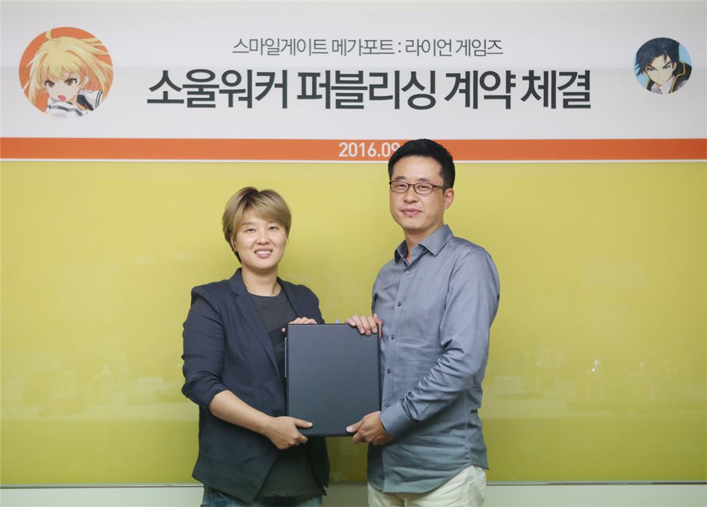 스마일게이트가 라이언 게임즈와 온라인 게임 신작 '소울워커' 퍼블리싱 계약을 체결했다. 장인아 스마일게이트 메가포트 대표(왼쪽)과 윤성준 라이언 게임즈 대표가 기념촬영을 하고 있다.<br />