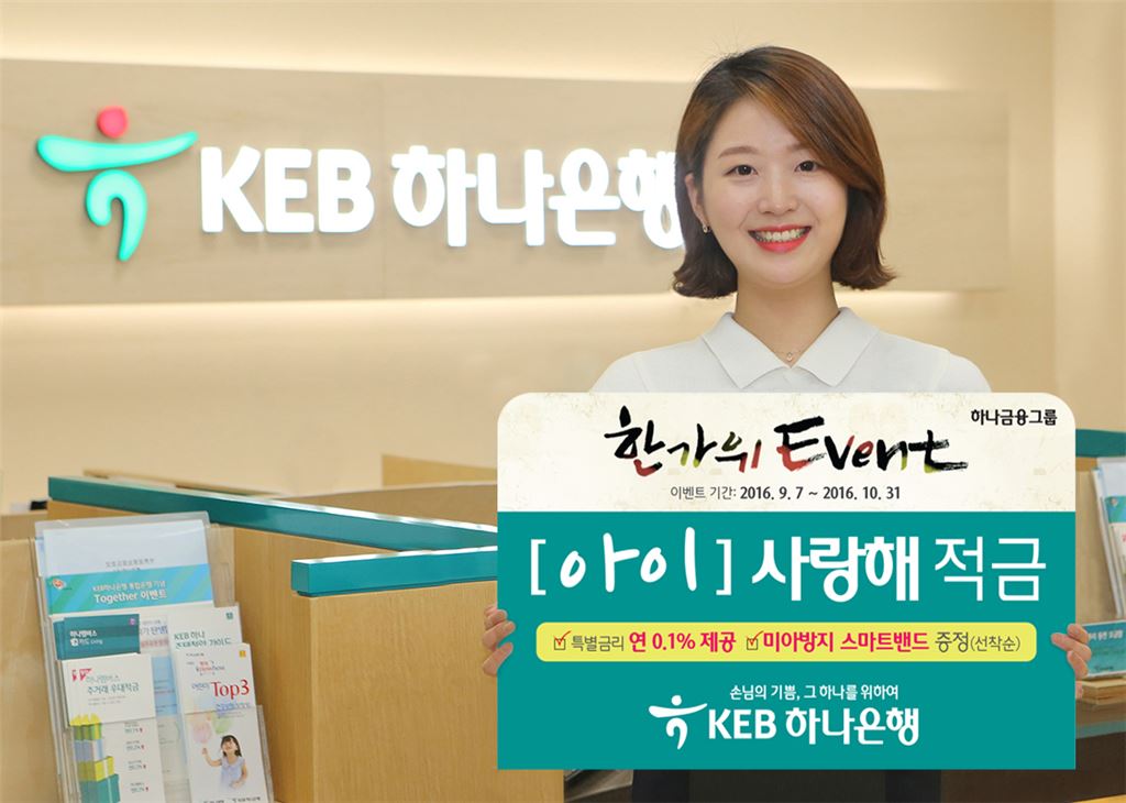 [아시아경제 정현진 기자]KEB하나은행이 추석을 맞아 다음달 말까지 어린이 적금 상품인 '(아이) 사랑해 적금' 특별 금리 제공 및 사은품 증정 행사를 실시한다고 7일 밝혔다. '(아이) 사랑해 적금'은 만 14세 이하의 어린이가 가입 대상으로 아이와 가족의 각종 은행거래 실적에 따라 최대 연1.0%의 우대금리를 추가 제공하는 '가족 거래 연계 적금' 상품이다. 행사기간 중 가입 시, 1년제의 경우 기본금리 연1.7%(종전 연 1.6%에서 0.1% 가산된 특판금리)에 우대금리 최대 연1.0%를 더해 최고 연2.7%가 적용되고, 3년제의 경우 연3.1%까지 적용 가능하다.또 같은 기간 동안 이 적금에 가입한 손님이 KEB하나은행에 주택청약종합저축을 보유하고 있거나 신규로 가입하면, 선착순 1000 명에게 스마트폰과 연동해 아동의 위치를 알려주는 미아방지밴드도 증정한다. 정현진 기자 jhj48@asiae.co.kr<ⓒ세계를 보는 창 경제를 보는 눈, 아시아경제(www.asiae.co.kr) 무단전재 배포금지>