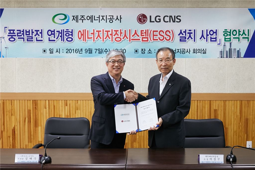 김태극 LG CNS 부사장(왼쪽)과 이성구 제주에너지공사 사장