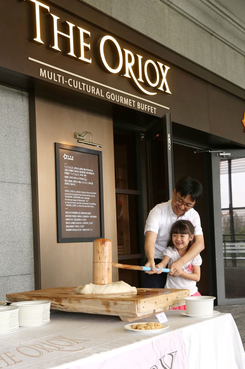 오리옥스 코엑스점을 방문한 아이가 아빠와 함께 떡메치기 체험을 하고 있다.<br />