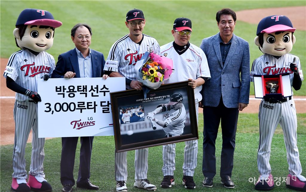 [아시아경제 김현민 기자]프로야구 두산 베어스와 LG 트윈스의 2016 KBO리그 경기가 9일 잠실구장에서 열렸다. LG 박용택(가운데)이 프로야구 통산 3,000루타 달성 시상식을 하고 있다. 왼쪽부터 백순길 LG단장, 박용택, 양상문 감독, 김시진 경기감독관.김현민 기자 kimhyun81@asiae.co.kr<ⓒ세계를 보는 창 경제를 보는 눈, 아시아경제(www.asiae.co.kr) 무단전재 배포금지>
