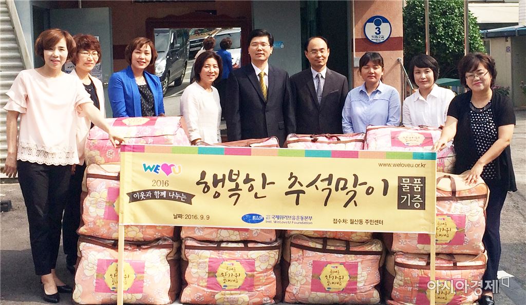 [아시아경제 노해섭 기자]광주 남구(구청장 최영호) 월산동주민센터에서 지난 9일 ‘행복한 추석맞이 물품기증’ 행사가 열렸다. 국제 위러브유 운동본부는 이날 이곳 동주민센터에 100만원 상당의 겨울용 극세사 이불을 기부했다. 사진제공=광주시 남구<ⓒ세계를 보는 창 경제를 보는 눈, 아시아경제(www.asiae.co.kr) 무단전재 배포금지>