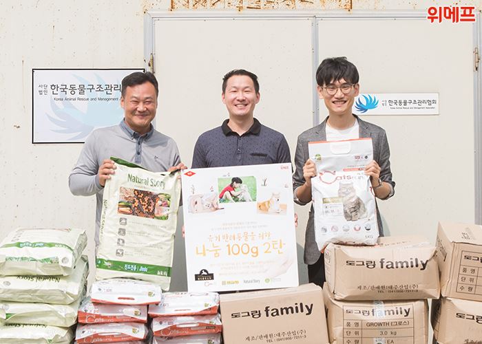 대주사료 엠디클러스터 정우철 이사, 한국동물구조관리협회 임성규 사무국장, 위메프 이선호MD가 유기반려동물을 위한 지난 9일 사료 전달식에 참석해 전달식 기념 촬영을 하고 있다.(사진=위메프 제공)<br />