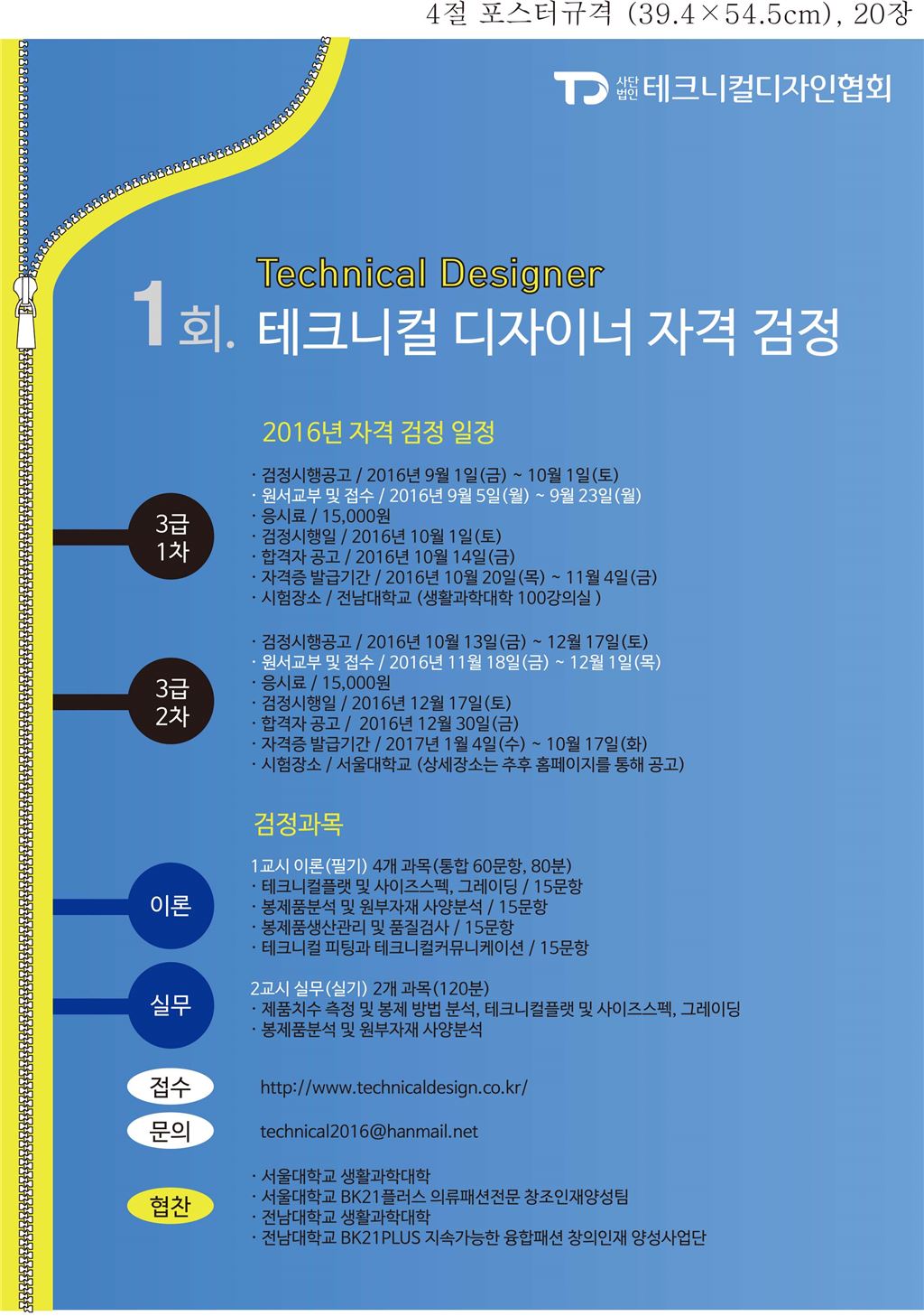 [아시아경제 노해섭 기자]제1회 테크니컬디자이너 자격검정 3급 시험이 오는 10월 1일 전남대학교에서 실시된다.글로벌 패션산업을 선도할 테크니컬디자이너 양성을 위해 국내에서 처음 시행하는 이번 자격 검정시험은 사단법인 테크니컬디자인협회(Association of Technical Design Corporation, 회장 남윤자)가 주관하고, 전남대학교 의류학과 BK21PLUS사업단과 생활과학대학이 후원한다.사단법인 테크니컬디자인협회는 패션산업의 과학화 및 지식생산 산업으로서의 기반조성, 글로벌화에 따라 중요한 패션전문직으로 떠오른 ‘테크니컬디자이너’양성을 목적으로 설립됐으며, 직무능력 완성도가 높은 테크니컬디자이너 양성을 위해 자격검정 과정을 운영하고 있다. 이번 자격검정 시험은 2016년 10~12월 사이에 두 차례에 실시되며 첫 번째가 전남대학교, 두 번째는 서울대학교에서 치러진다. 10월 1일(토) 전남대학교에서 시행될 3급 1차시험의 원서 교부 및 접수 기간은 9월 5일(월)~9월 12일(월)이며, 합격자는 10월 14일(금)에 발표한다. 시험은 필기와 실기를 동시에 시행하며, 시험시간은 각 80분, 120분이다. 원서는 테크니컬디자인협회 홈페이지(www.technicaldesign.co.kr)를 통해 접수할 수 있다. 기타 자세한 내용은 협회 홈페이지를 통해 확인할 수 있다. 노해섭 기자 nogary@<ⓒ세계를 보는 창 경제를 보는 눈, 아시아경제(www.asiae.co.kr) 무단전재 배포금지>