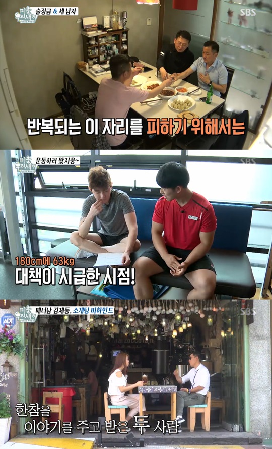 [아시아경제 송윤정 인턴기자] '미운우리새끼'가 미방송분을 공개해 눈길을 끌었다.16일 방송된 추석 특집 SBS ‘미운우리새끼’에는 그간 방송된 영상 편집본과 함께 주인공들의 비하인드 영상이 공개됐다. 그간 방송에서 알콜 중독과 게임 중독에 빠진 듯한 모습을 보인 김건모는 비하인드 영상에서도 소속사 대표와 함께 술을 마시는 모습이 노출됐다.이 때 소속사 대표 역시 김건모처럼 자리에 앉자 마자 게임을 하는 모습을 보여 시청자들을 경악케 했다.자리에 함께 있던 다른 친구는 소속사 대표에게 "누가 보면 스케줄 정리를 하는 줄 알겠다"고 타박해 웃음을 자아냈다.허지웅이 헬스장에 찾아간 모습도 공개됐다. 허지웅의 체지방 분석 결과, 키 180cm에 63kg이 나와 심각한 저체중이 의심됐다.허지웅은 트레이너에게 10kg 늘리기가 쉽지 않다고 하자 트레이너는 가장 시급한 것이 하체라면서 하체 운동에 주력했다.또한 논란이 됐던 김제동의 소개팅 비하인드 스토리도 공개됐다. 당초 김제동은 소개팅녀에게 전혀 집중하지 못하고 지나가는 행인들에게 이야기를 건네는 등 다소 무례한 태도를 보여 문제가 된 바 있다.하지만 공개된 영상에서 김제동은 소개팅녀에게 조근조근 이야기를 건네면서 대화를 이끌어가는 모습을 보였따. 스튜디오에서 이 모습을 보던 서장훈은 "부끄럽고 쑥스러워 일부러 아는 사람이 지나가면 더 알은 체 하는 거 같다"고 말했다.또한 제작진은 두 사람이 좋은 오빠 동생 사이로 지내고 있다고 알려 시청자들을 기대하게 했다. 송윤정 인턴기자 singasong@asiae.co.kr<ⓒ세계를 보는 창 경제를 보는 눈, 아시아경제(www.asiae.co.kr) 무단전재 배포금지>