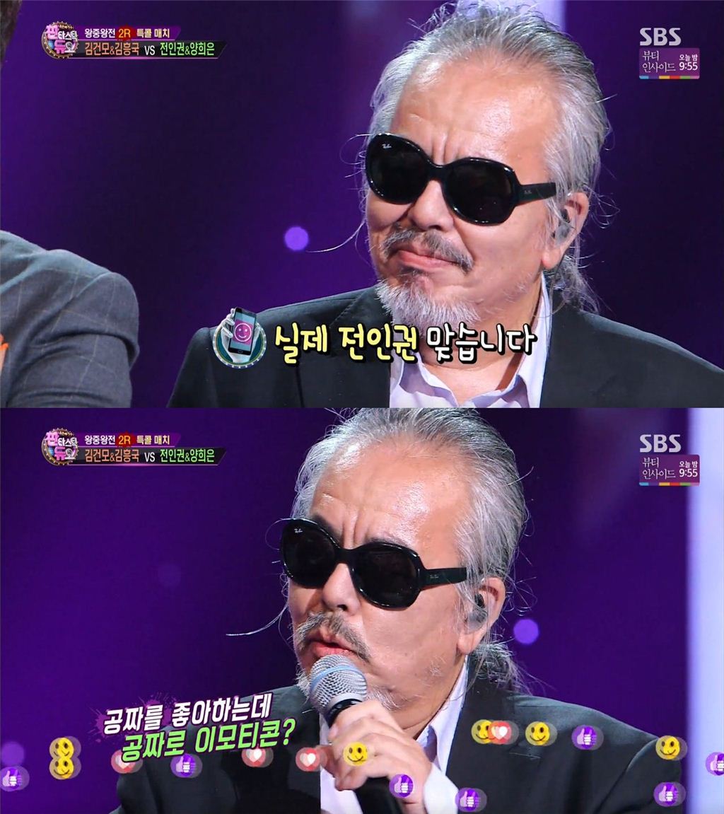 [아시아경제 김태우 인턴기자] '록의 전설' 전인권이 판타스틱 듀오에 나타났다. 18일 오후 방송된 SBS 예능프로그램 '판타스틱 듀오'에서는 가수 양희은과 전인권, 그리고 가수 김건모와 김흥국이 한 팀을 이뤄 콜라보 대결을 펼쳤다.이날 방송에서 MC 전현무가 "출연자 분들 중 특별한 인연이 있다고 들었다"고 묻자 전인권은 1970년대 19살 소년을 사로잡은 양희은과의 특별한 인연을 공개했다. 전인권은 "이분의 노래를 듣고 가수가 이렇게 지적일 수도 있구나 싶었다. 그 시절엔 이분의 노래를 듣고 감동을 받지 않은 사람이 없었다"며 애정을 표했다. 이에 양희은이 "나를 무서워했느냐"고 묻자 전인권은 "(지금도) 덜덜 떨고 있지 않느냐. 눈도 못 마주치겠다"고 답해 폭소케 했다.'판타스틱 듀오' 전인권 양희은 / 사진=SBS방송화면캡처