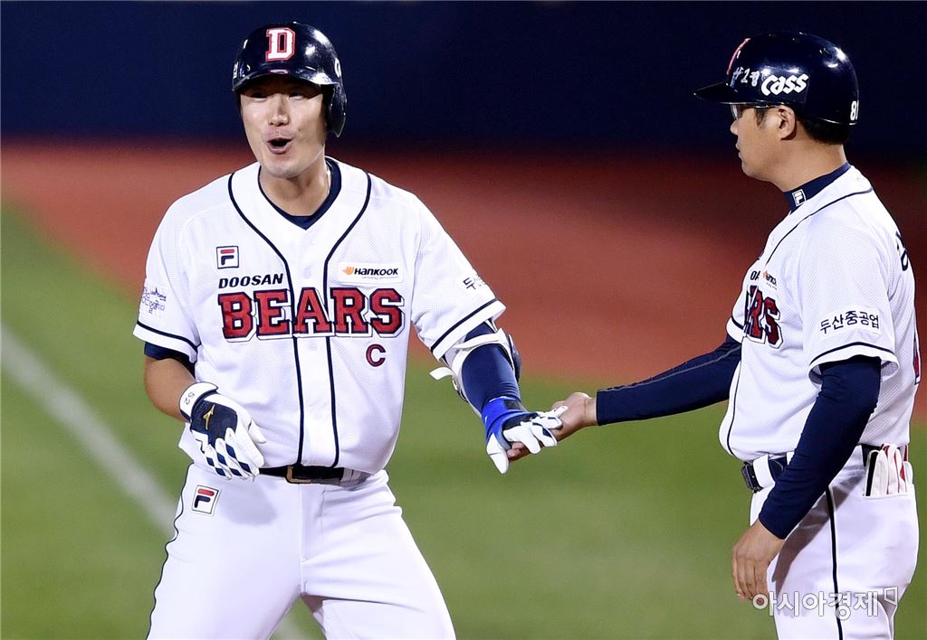 [아시아경제 김현민 기자]프로야구 삼성 라이온즈와 두산 베어스의 2016 KBO리그 경기가 20일 잠실구장에서 열렸다. 2회말 1사 2,3루에서 두산 김재호가 추가 2타점 적시타를 치고 강동우 코치와 하이파이브하고 있다. 김현민 기자 kimhyun81@asiae.co.kr<ⓒ세계를 보는 창 경제를 보는 눈, 아시아경제(www.asiae.co.kr) 무단전재 배포금지>