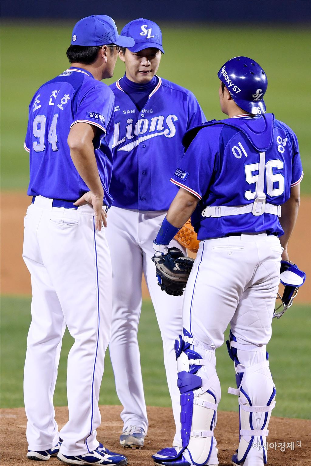 [아시아경제 김현민 기자]프로야구 삼성 라이온즈와 두산 베어스의 2016 KBO리그 경기가 20일 잠실구장에서 열렸다. 삼성 선발투수 정인욱이 2회말 4실점한 뒤 마운드를 방문한 조진호 코치와 이야기를 나누고 있다. 김현민 기자 kimhyun81@asiae.co.kr<ⓒ세계를 보는 창 경제를 보는 눈, 아시아경제(www.asiae.co.kr) 무단전재 배포금지>