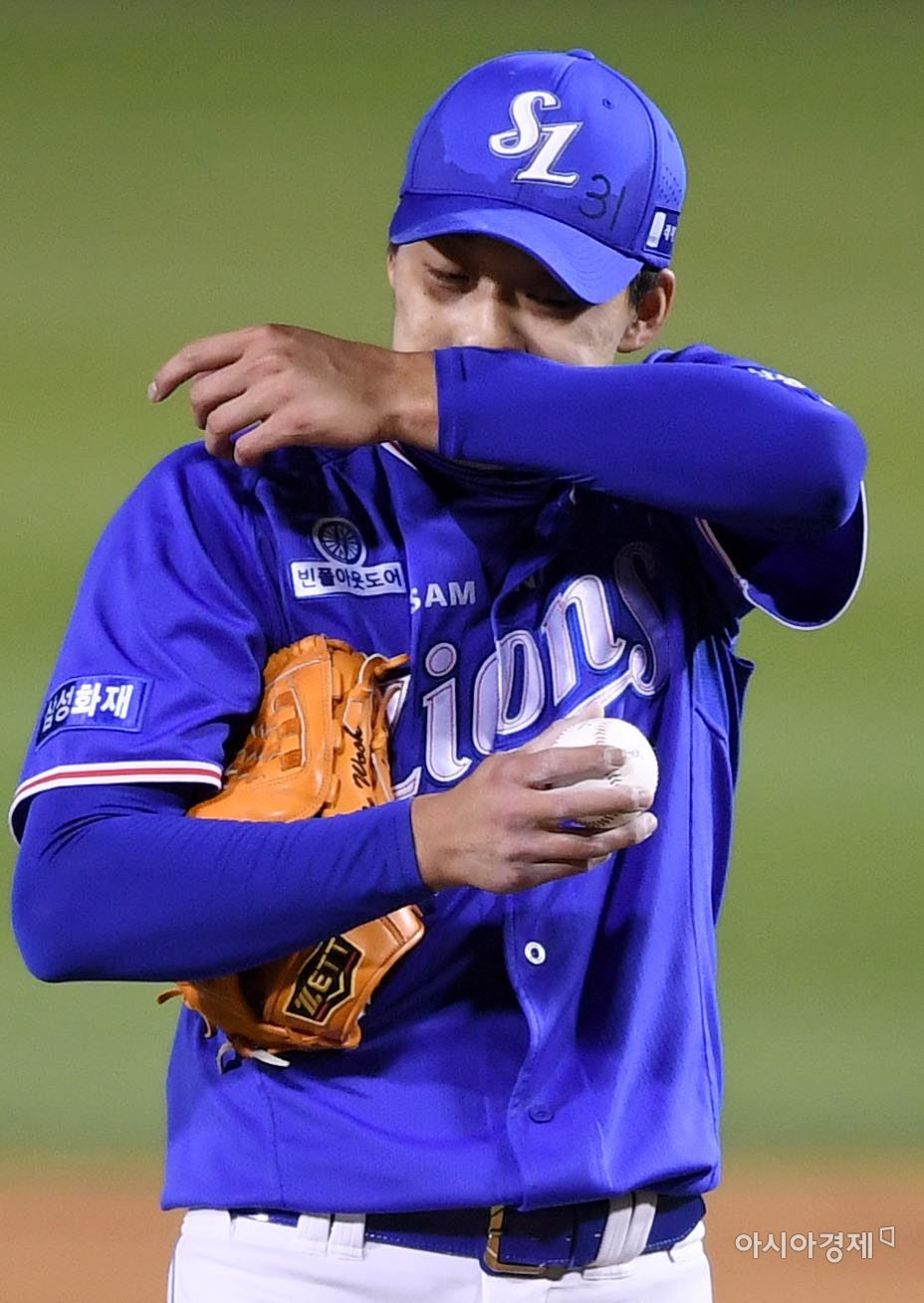 [아시아경제 김현민 기자]프로야구 삼성 라이온즈와 두산 베어스의 2016 KBO리그 경기가 20일 잠실구장에서 열렸다. 삼성 선발투수 정인욱이 2회말 4실점한 뒤 땀을 닦고 있다. 김현민 기자 kimhyun81@asiae.co.kr<ⓒ세계를 보는 창 경제를 보는 눈, 아시아경제(www.asiae.co.kr) 무단전재 배포금지>