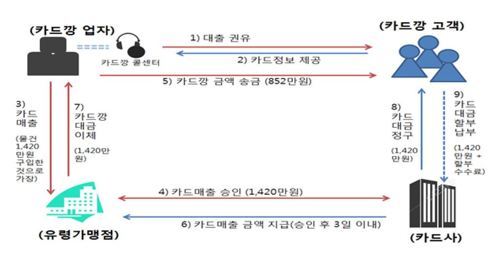 금융감독원에 접수된 ‘카드깡’ 피해 사례들이다. 금감원은 지난해 1월부터 올해 6월까지 2만7921건의 카드깡과 유사수신 등 불법 카드 거래행위를 분석해 척결 대책을 추진한다고 21일 밝혔다. 지난 5월 한달간 카드깡 고객 중 수취금액이 확인된 696명을 심층 분석한 결과, 1인당 카드깡 이용금액은 평균 407만원, 최대 4000만원에 이르는 것으로 조사됐다. 카드깡은 연 240% 안팎의 수수료와 20%가량의 카드할부 수수료가 발생한다. 카드깡 이용시 평균 23.8%를 차감하며 대개 24개월 할부로 결제되기 때문이다. 이로 인해 소비자의 실제 부담은 수령액의 1.7배에 이른다. 예를 들어 카드깡으로 400만원을 받았다면 카드깡 수수료 158만원, 24개월 할부 수수료 116만원을 포함해 674만원의 부담을 지게 되는 것이다. 지난해 카드깡을 이용했던 고객의 43%가 1~6등급, 23.5%가 지난 6월 말 현재 연체 중이었다. 카드깡 대금 할부기간을 감안하면 연체 고객은 더 증가할 것으로 예상된다. 카드깡 피해자들은 향후 결제가 얼마나 될지 모르고 저렴한 대출이라는 말에 현혹됐으며, 신한금융이나 롯데론 등으로 정식 등록된 금융회사인 것처럼 거짓 소개하는 것을 그대로 믿은 경우가 대부분이었다. 급전이 필요한 경우 대부업체를 이용하면 신용등급이 하락할 것을 우려해 카드깡을 이용하기도 했다. 카드깡 업자들은 온라인쇼핑몰에서 손쉽게 유령 판매점을 만들어 카드깡에 이용한 후 사라지는 수법을 주로 사용하고 있다. 금감원은 가맹점 신규 등록시 예외 없이 영업현장을 확인해 유령 가맹점 등록을 원천 차단키로 했다. 향후 카드사를 검사할 때 가맹점 심사 업무를 철저히 이행하고 있는지를 집중 점검할 예정이다. 또 이상거래탐지시스템(FDS)에서 탐지가 되면 즉시 가맹점 현장실사를 하고 유령 가맹점으로 확인되면 카드거래를 중단시킨다. 지자체와 통신사 등과 협조를 강화해 국세, 지방세, 통신비 등 요금 납부 대행을 가장한 카드깡을 차단키로 했다. 적발된 카드깡 업체에 대해서는 예외 없이 경찰에 수사 의뢰하고 국세청에도 통지해 세금부과 등에 활용토록 조치한다. 여신전문금융업법에는 카드깡 업자에 대해 3년 이하 징역이나 2000만원 이하 벌금에 처하도록 규정돼 있다. 금감원은 “카드깡 이용 당시에는 앞으로 얼마나 청구될지 모르다가 막상 엄청난 결제가 이뤄지고 나면 연락도 닿지 않는 경우가 많으며, 이용 고객도 카드 거래한도 축소나 거래 제한 등 제재 조치가 부과될 수 있다”면서 “대출 권유 전화를 받았다면 금감원 홈페이지에서 등록 금융회사인지 여부를 먼저 확인할 필요가 있다”고 조언했다. 이어 “카드번호와 CVC번호(카드 뒷면 보안코드) 등 카드 정보를 요구하는 업체는 불법사금융 업체일 가능성이 높으므로 철저한 확인이 필요하다”고 했다. 박철응 기자 hero@asiae.co.kr<ⓒ세계를 보는 창 경제를 보는 눈, 아시아경제(www.asiae.co.kr) 무단전재 배포금지>