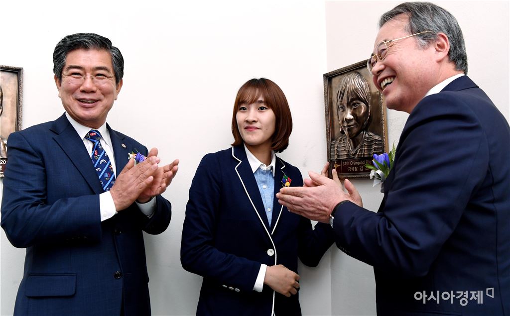 [아시아경제 김현민 기자]21일 서울 송파구 한국체육대학교에서 열린 2016 리우올림픽 금메달리스트 청동두상 및 올림픽 100번째 메달 기념판 부착식에서 태권도 김소희가 김성조 한체대 총장, 강영중 대한체육회장과 함께 청동두상을 부착하고 있다. 김현민 기자 kimhyun81@asiae.co.kr<ⓒ세계를 보는 창 경제를 보는 눈, 아시아경제(www.asiae.co.kr) 무단전재 배포금지>