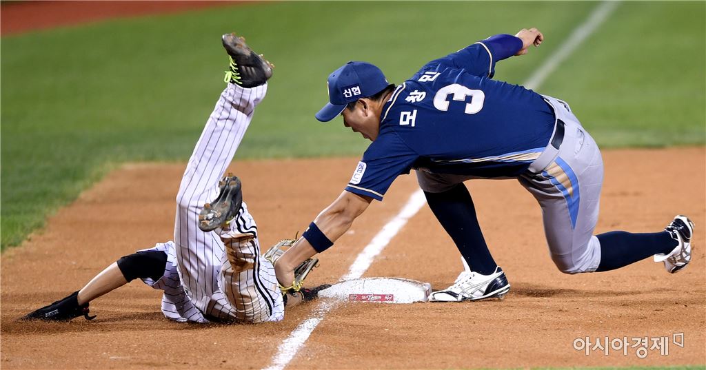 [아시아경제 김현민 기자]프로야구 NC 다이노스와 LG 트윈스의 2016 KBO리그 경기가 21일 잠실구장에서 열렸다. 3회말 2사 1,3루에서 LG 히메네스 타석 때 3루주자 김용의가 포수 견제에 걸려 NC 3루수 모창민에 태그아웃되고 있다. 김현민 기자 kimhyun81@asiae.co.kr<ⓒ세계를 보는 창 경제를 보는 눈, 아시아경제(www.asiae.co.kr) 무단전재 배포금지>
