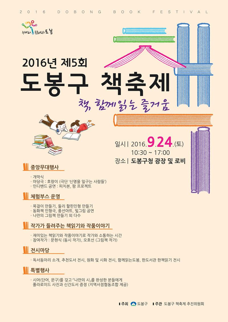 구청광장에는 누구나 자유롭게 관람이 가능하게 중앙행사장을 마련한다. 오전 11시 초등학교 어린이들의 ‘모듬북 공연’과 ‘어린이 합창’이 축제의 서막을 알리며, 전래동화에 등장하는 호랑이 이야기를 재미나게 엮은 마당극 ‘호랑이歌’와 어른들도 즐길 수 있는 인디밴드 ‘팜 프로젝트’, ‘피치본’의 음악공연이 이어진다.구청 로비부스에는 동시 작가 문현식, 그림책 작가 오호선과 함께하는 ‘작가와 만남’이 마련돼 책읽기와 작품에 대해 깊이 있게 알아보고 관객과 직접 소통하는 기회를 제공할 예정이다.특별행사인 ‘나만의 시’ 만들기 참가자에게는 폴라로이드 기념사진과 도봉구 지역서점협동조합이 제공하는 책을 선물하여 가족단위 관람객들에게 색다른 추억을 선사한다.이 밖에도 ‘함께 읽는 도봉’과 연계한 올해의 함께 읽기 좋은 책 선정도서와 시화 전시, 그림책 원화 전시가 진행된다. 체험부스에서는 목걸이만들기, 둘리 할핀인형 만들기, 동화책 인형극, 풍선아트 등이 준비돼 참여자의 흥미와 재미를 더할 것으로 보인다.이동진 도봉구청장은 “올해로 5회를 맞이하는 도봉구 책축제가 구민 참여형의 독서문화 축제인 만큼 일회성 독서 행사에 그치지 않고, 온 구민이 함께 독서의 즐거움을 공유하고 이야기 나눌 수 있는 교육·문화의 장으로 거듭나길 바란다”고 밝혔다.박종일 기자 dream@asiae.co.kr<ⓒ세계를 보는 창 경제를 보는 눈, 아시아경제(www.asiae.co.kr) 무단전재 배포금지>