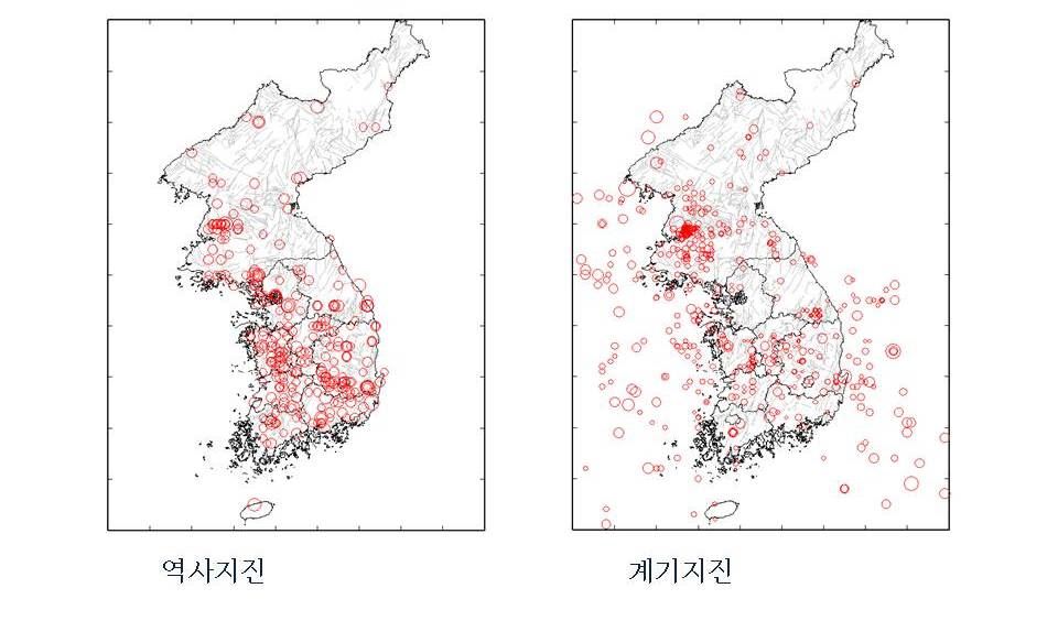 ▲역사(왼쪽)와 계기지진 진앙분포를 비교한 결과 비슷하게 나타났다.