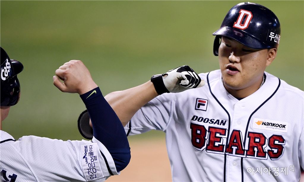[아시아경제 김현민 기자]프로야구 kt 위즈와 두산 베어스의 2016 KBO리그 경기가 22일 잠실구장에서 열렸다. 6회말 무사 2루에서 두산 오재일이 kt 선발 주권을 상대로 역전 투런 홈런을 치고 동료들과 기뻐하고 있다. 김현민 기자 kimhyun81@asiae.co.kr<ⓒ세계를 보는 창 경제를 보는 눈, 아시아경제(www.asiae.co.kr) 무단전재 배포금지>