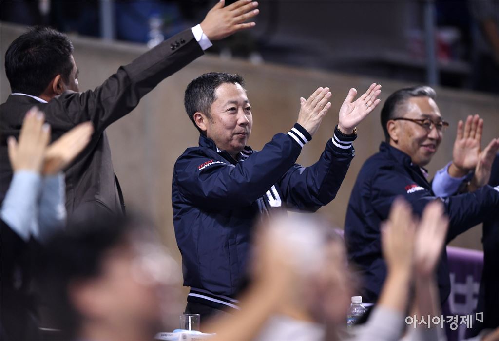 [아시아경제 김현민 기자]프로야구 두산 베어스가 안방에서 21년 만에 정규시즌 우승을 확정했다. 두산은 22일 잠실구장에서 열린 2016 타이어뱅크 KBO리그 홈경기에서 kt 위즈에 9-2로 이겼다. 90승1무46패로 선두. 2위 NC 다이노스(74승3무5패)와 격차는 11.5경기를 유지했다. 두산이 남은 일곱 경기에서 모두 지고, 열네 경기 남은 NC가 전승을 해도 승수에서 두산이 앞서 우승이 확정됐다. 박정원 두산그룹 회장이 우승을 확정짓고 박수치며 기뻐하고 있다. 김현민 기자 kimhyun81@asiae.co.kr<ⓒ세계를 보는 창 경제를 보는 눈, 아시아경제(www.asiae.co.kr) 무단전재 배포금지>