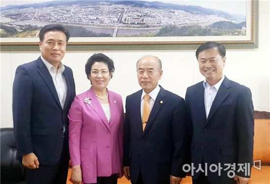 김복실 장흥군의회 의장(왼쪽에서 두번째)이 이석보 남원시의회 의장(오른쪽 두번째)과 기념촬영을 하고있다.