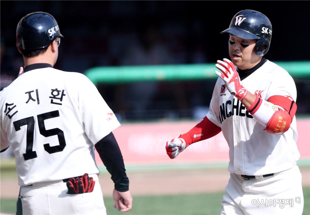 [인천=아시아경제 김현민 기자] 프로야구 한화 이글스와 SK 와이번스의 2016 KBO리그 경기가 25일 인천 SK행복드림구장에서 열렸다. 2회말 1사 1루에서 SK 나주환이 한화 심수창을 상대로 추가 투런 홈런을 치고 손지환 코치와 하이파이브하고 있다. 김현민 기자 kimhyun81@asiae.co.kr<ⓒ세계를 보는 창 경제를 보는 눈, 아시아경제(www.asiae.co.kr) 무단전재 배포금지>